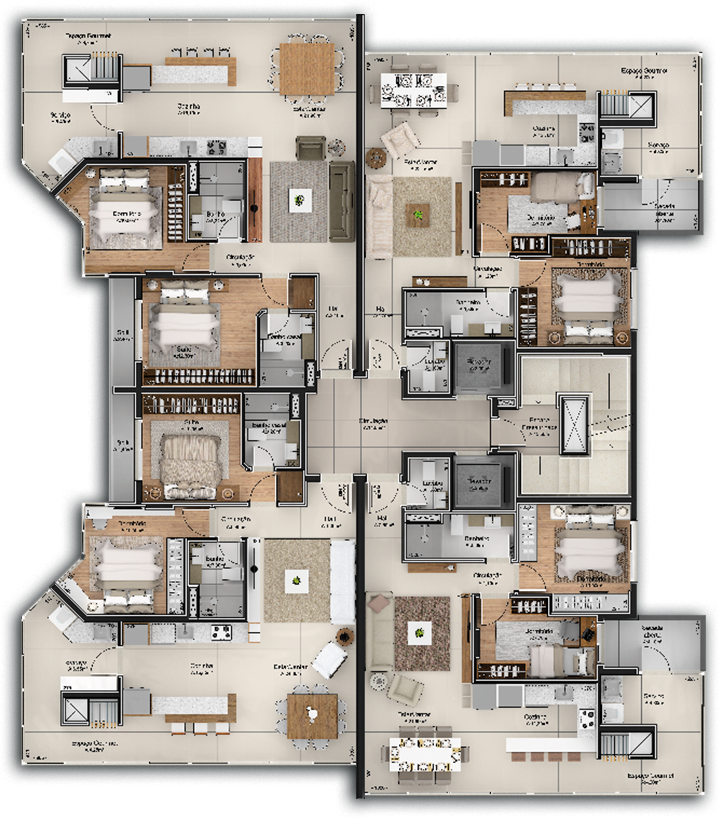 - 25 apartamentos com metragens variadas entre 30m2 e 54m2, com 1 e 2 dormitórios;